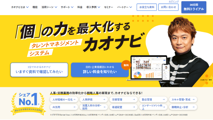 カオナビは、社員の顔写真とスキル、評価、適性などの人材情報を一元化し、戦略的な人事を支援するクラウド型タレントマネジメントシステムです。