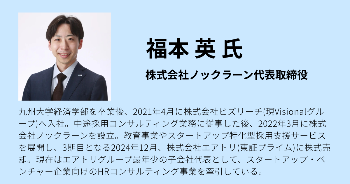 福本氏はノンエクイティで事業を成長させ、創業わずか3期目・27歳で東証プライム上場企業・株式会社エアトリへの株式譲渡を実現した起業家だ。