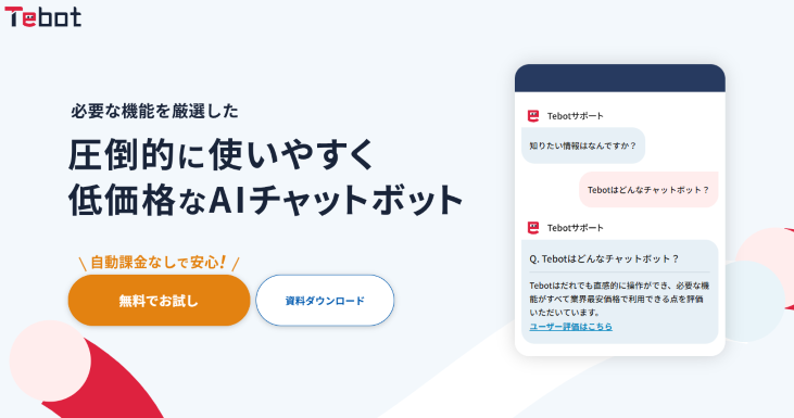 「Tebot」は、他サービスよりも価格が安く機能も必要なものだけに絞られているため、誰でも簡単に運用が可能なチャットボットです。