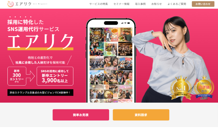 「Sリクルート」は、総フォロワー数200万人を誇る正社員インフルエンサーが監修する採用特化のSNS運用代行で、採用人数の増加が売り上げに直結しやすい企業に特におすすめのサービスです。