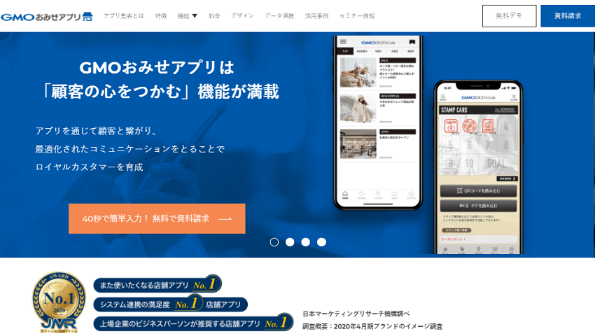 「GMOおみせアプリ」は、低コスト・短期間で、プッシュ通知、クーポンなどの集客・販促機能が豊富な自分のお店のアプリが作れるサービスです。