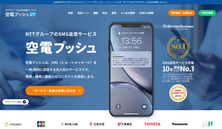 「空電プッシュ」は、SMS送信サービス市場7年連続シェアNo.1*、大手金融機関など高いセキュリティが求められる業界でもトップシェアを誇るSMS送信の法人向けサービスです。