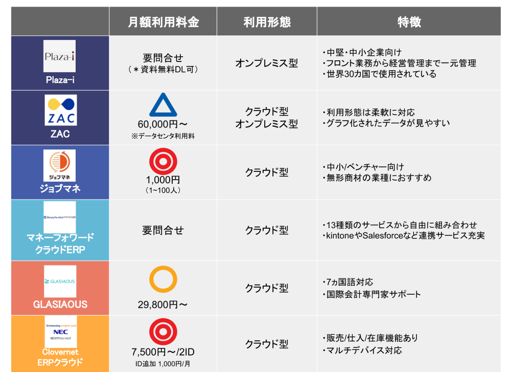 おすすめERPを「利用形態」「対象規模や業種」「統合型/特化型」「特徴」「費用」で比較します。