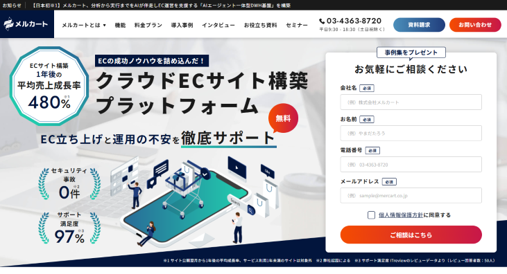 「メルカート」は中堅・大手企業で豊富な導入実績を誇る国産クラウドECプラットフォームであり、AIによる顧客行動の分析・予測に基づき売上施策を自動化する高度な支援機能が強みです。