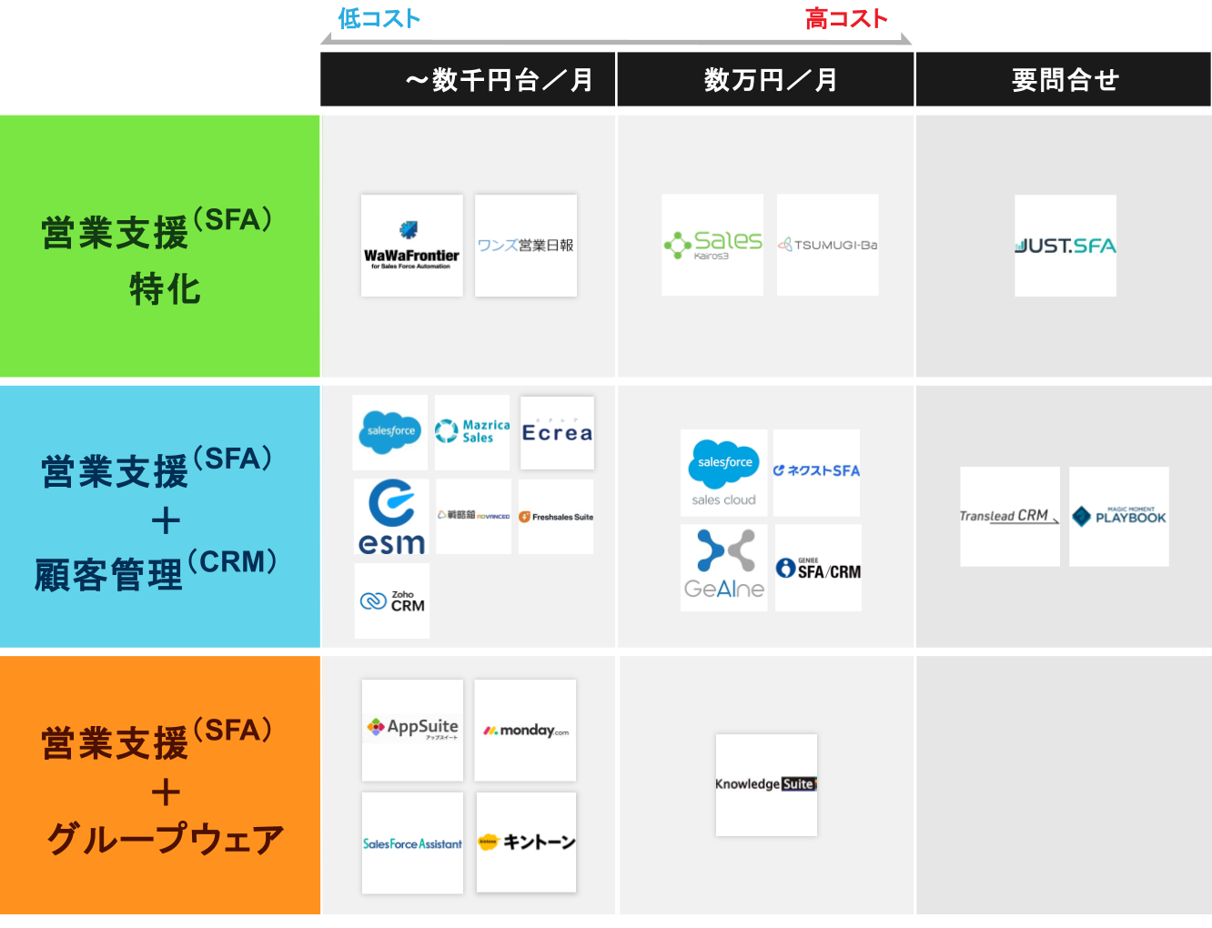 | 月額5000円未満 | SFAの基本的な機能 | 初めてSFAを導入する企業 小規模チーム |
