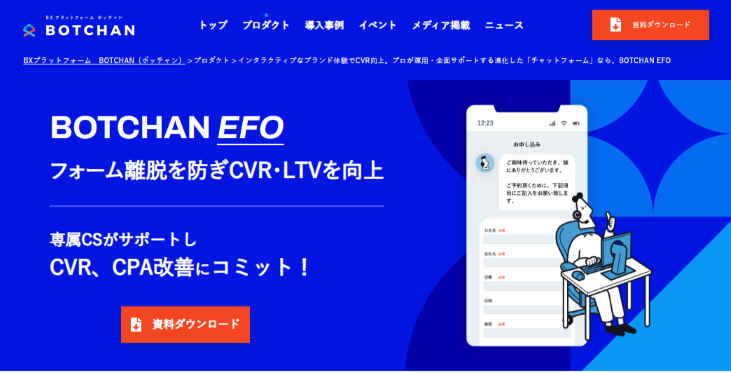 BOTCHAN EFOは、入力フォームとチャットボットを掛け合わせ、売上改善・成約率向上に特化したチャットボットです。
