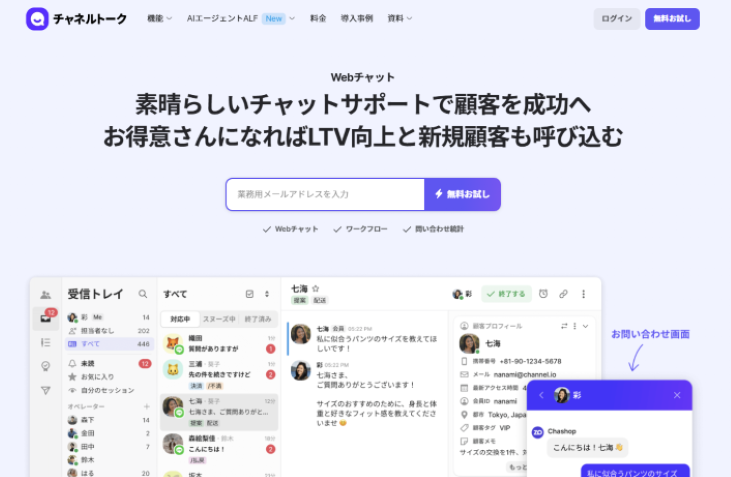 機能としては、顧客向けWebチャット・社内向けビジネスチャット・カスタマーマーケティングの3つがあり、無料プランでは、Webチャットとビジネスチャットが利用可能です。