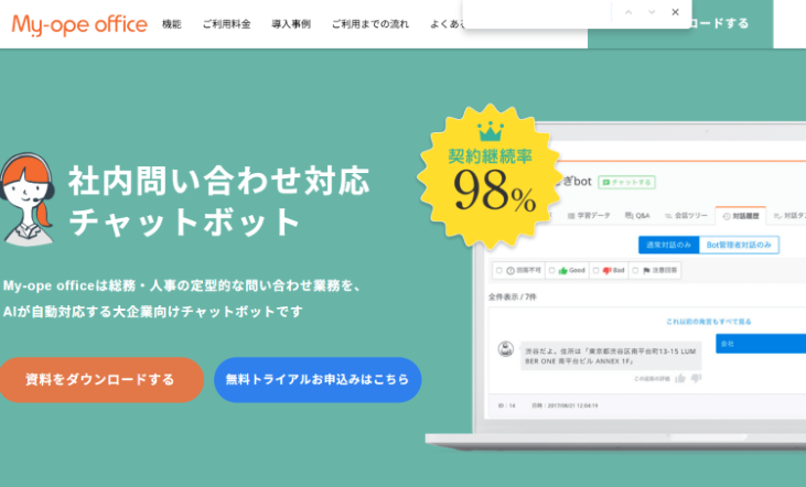 My-ope officeはチャット形式でAIが学習していく機能を搭載しているチャットボットです。
