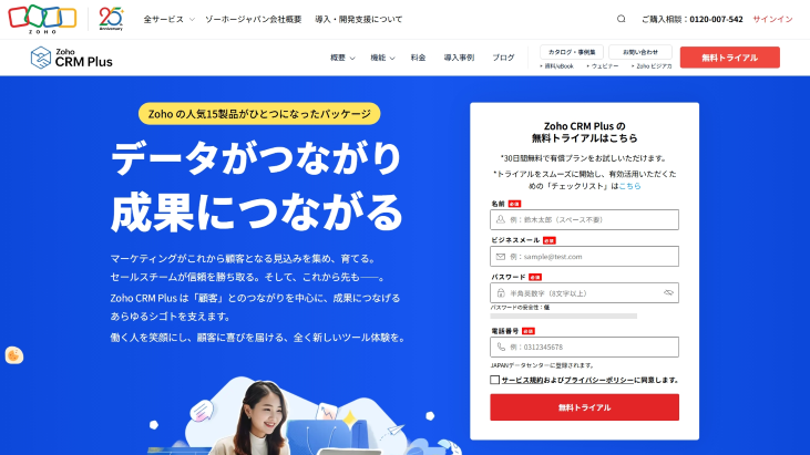 「Zoho CRM Plus」は、マーケティングをはじめ、営業やサポート業務など、顧客との接点を網羅的にカバーする、マーケティングオートメーションツールです。