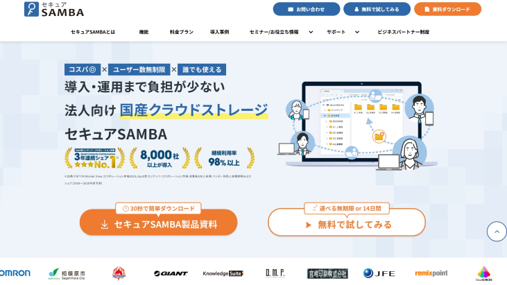 セキュアSAMBAは、導入実績8,000社以上、従業員100人未満のオンラインファイル共有市場で3年連続シェアNo.1を獲得している法人向け国産オンラインストレージです。