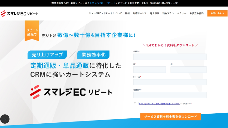 スマレジEC・リピートは、単品・リピート通販向けに特化し、LTVや売上向上などの成果実績も豊富なカートシステムです。