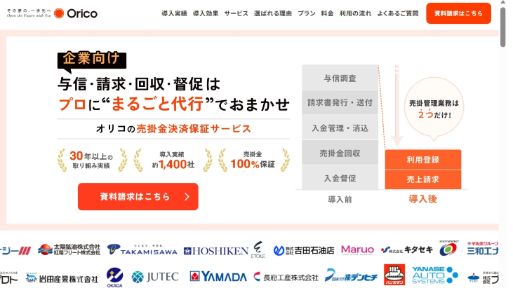 オリコのB2B決済サービスは、与信審査から請求、回収、督促までの一連の業務を代行し、未回収リスクを100%保証することで、企業の業務効率化と売上拡大を支援します。