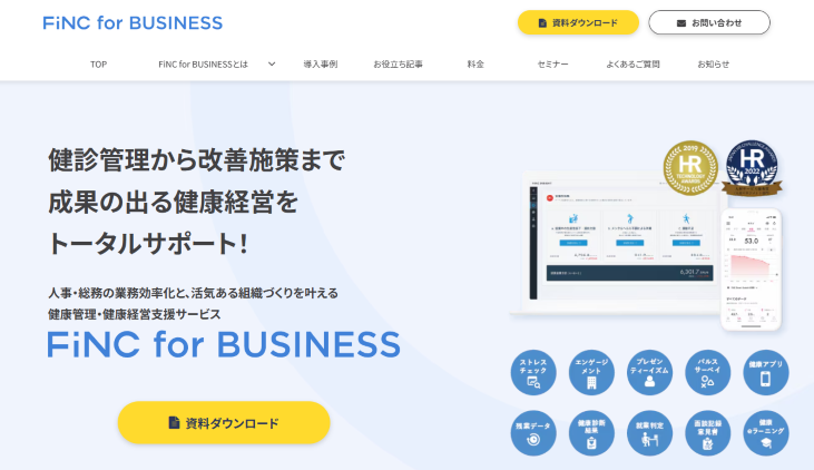 FiNC for BUSINESSは、大企業を中心に320社以上の導入実績をもつ、産業保健業務の効率化と社員の健康行動をサポートするクラウド型のソフトです。