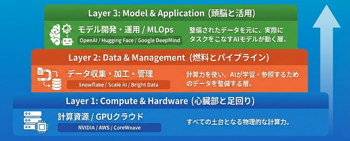 AIモデルの学習や推論を行うための「物理的なパワー」を提供する層です。