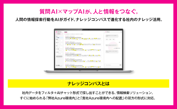 ナレッジコンパスは、社内に蓄積された資料(PDF・Word・Excel・PowerPointなど)をAIで整理し、必要な情報をすぐに検索できるナレッジ検索システムです。