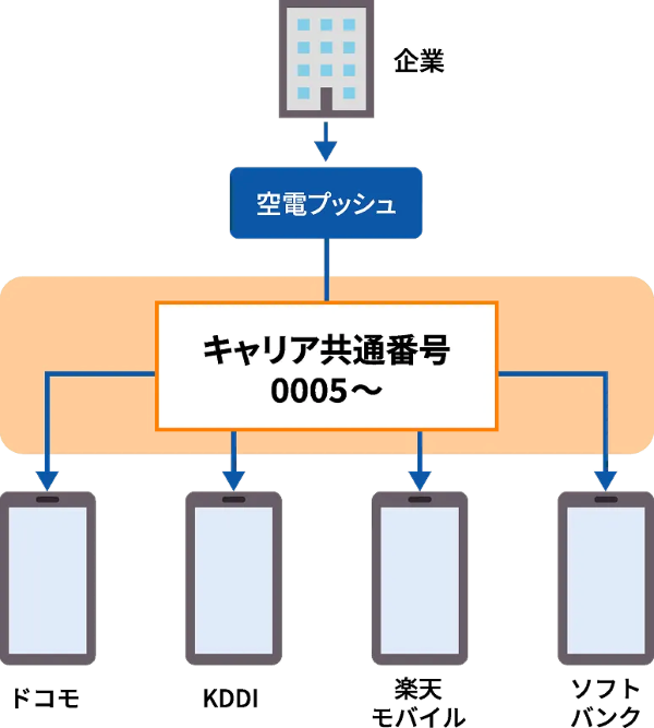 「空電プッシュ」は、各携帯キャリアの厳正な審査を通過した企業・団体のみが利用できる「キャリア共通番号(10桁または短縮番号)」での送信に対応しています。