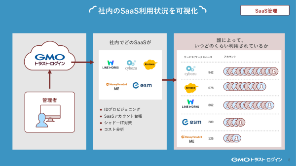 GMOトラスト・ログインは、IDを軸にSaaSを一元管理することで、契約の可視化やアカウント運用の自動化を実現。