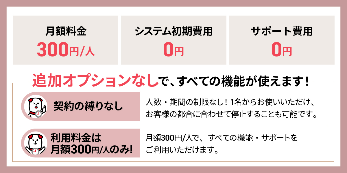 Touch On Timeは一人300円(税抜)で、導入後の追加費用がかからないので、ランニングコストを気にする企業でも安心して導入できます。