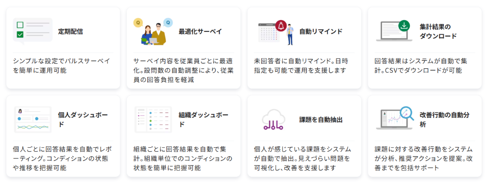 質問数は調整可能で、機能の柔軟性も高く、各企業の組織課題や運用体制に合わせたカスタマイズが可能です。