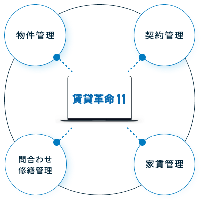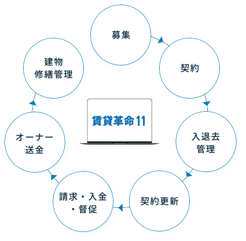賃貸革命11は、賃貸管理業務の流れに沿って開発されたシステムなので、これひとつの導入でワンストップでの運用が可能です。