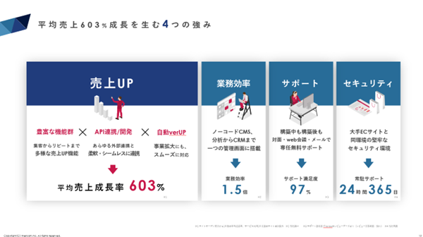 実際に導入企業ではリニューアル後の売上向上や運営効率の改善につながった事例も多く、EC強化を本気で考える企業に適したサービスといえるでしょう。