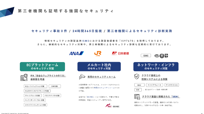 メルカートは、これまで自社起因の事故ゼロ件という堅牢なセキュリティ実績を有しています。