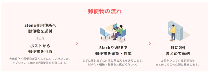 atenaは郵便物の受け取りから倉庫保管まで、すべての郵便物管理を委託できる郵便物管理サービスです。