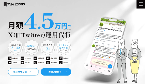 アルパカSNSは、月額4.5万円からの手頃な価格で導入できるSNS運用代行サービスです。