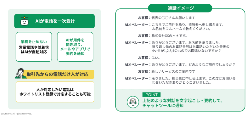 アイブリー(旧IVRy)は、最短即日で導入可能!月額3,000円程度からの低コストで利用できる電話自動応答サービスです。