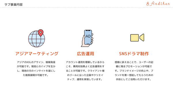 株式会社アンドゼンは、SNSマーケティングにおける市場調査から企画〜撮影編集〜レポート作成まで丸ごと運用代行のほか、自社SNSメディアの運営も行なっています。