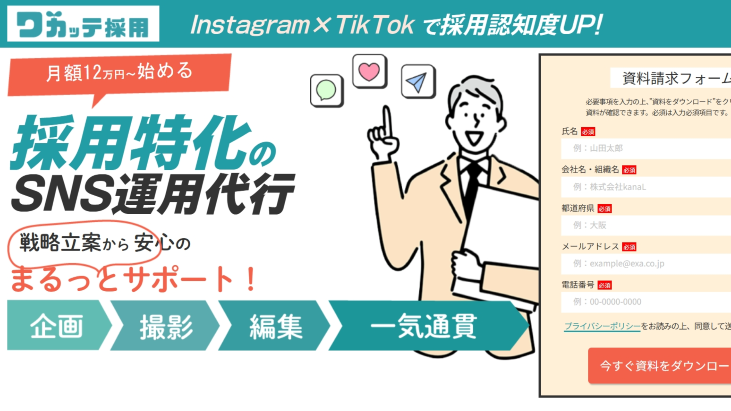 株式会社kanaLの「ワカッテ採用」は、TikTok・Instagramの同時運用とSNS広告の活用で、全国に拠点がない特定地域での採用成果を最大化する採用に特化したSNS運用代行サービスです。