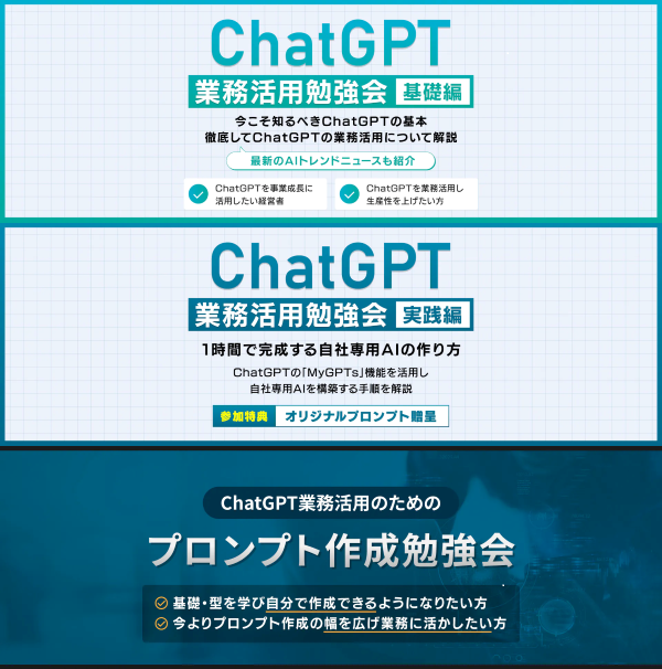 さらに、追加費用なしで受けられる「ChatGPT活用基礎講座」や「プロンプト作成講座」といった勉強会を開催し、利用企業のデジタル人材育成をサポートしてくれる点も心強いです。