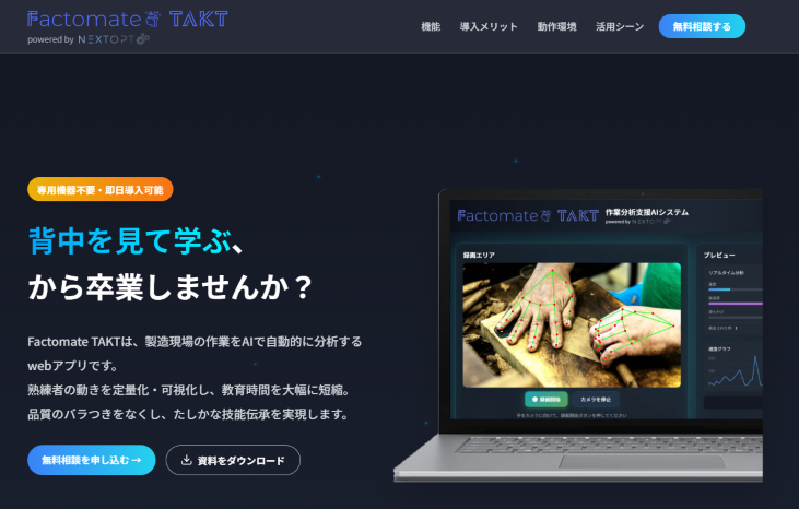 Factomate TAKTは、生産管理に直結する作業分析AIです。作業工程を自動で分割・認識し、各工程の所要時間を計測してボトルネックを即座に特定するだけでなく、熟練者の動作を数値化・可視化 し、品質のバラつきをなくすことで生産の安定化と効率化を支援します。