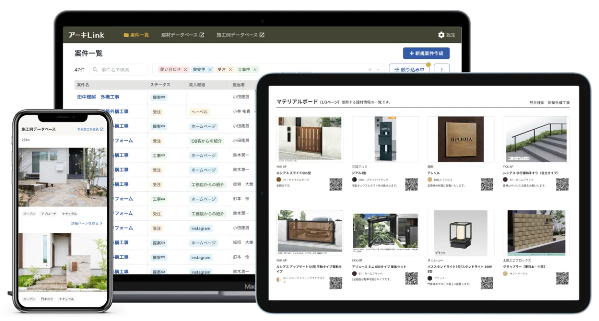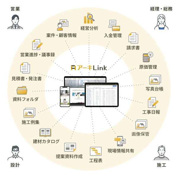 アーキLinkは、建設業における「営業・設計・工事・事務」のすべての業務領域を一つのプラットフォームで完結できるクラウド型統合システムです。