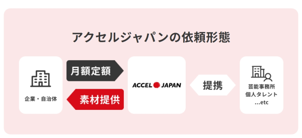 アクセルジャパンは、定額制で有名タレントの肖像を自社の広告や販促に活用できる、新しい形の素材シェアリングサービスです。