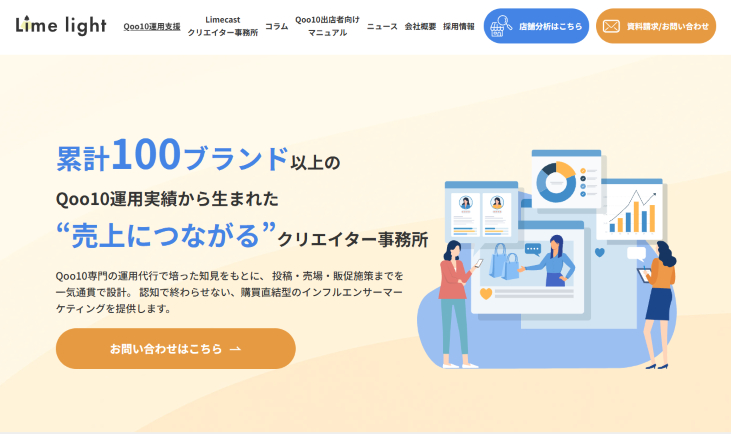 「Limelight株式会社(Limecast Qoo10特化型クリエイター事務所)」は、単なるPR投稿にとどまらず、ECモールQoo10での売上最大化に特化したインフルエンサーマーケティングを行います。