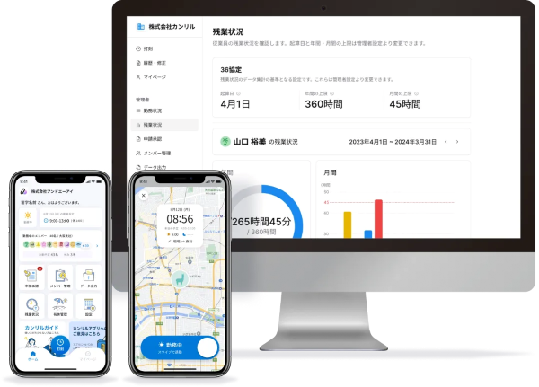 カンリルで従業員が打刻したデータはクラウド上でリアルタイムに同期され、労働時間や残業時間が自動で集計されます。