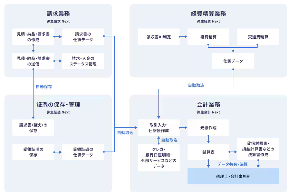 弥生会計 Nextを導入することで、請求書の発行から経費精算、帳簿付け、決算書作成までのデータが一気通貫でつながります。